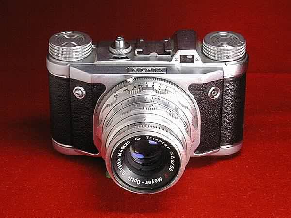 Ich liebe diese Kamera: Richtig schweres, robustes Gehäuse, Räder. Knöpfe, Schrauben, Metall...: Diese Kleinbildkamera von Altissa (vormals Ernst Hofert, Dresden, später VEB Pentacon), vermutlich eine Altix V, wurde etwa von 1952 bis 1956 gebaut. Meine Kamera hat einen Tempor-Zentralverschluss mit Zeiten bis 1/250 sec. und ein (Wechsel-) Objektiv Trioplan 1:2,8/50 mm (Bajonett!) von Meyer-Optik Görlitz. Ein weiteres passendes Objektiv finden Sie hier. Das Filmladesystem ähnelt dem Leica-System (Bodenplatte entfernen). |