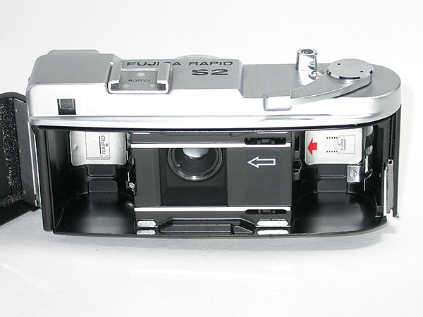 | Hübsche, solide Kamera nach dem Agfa-Rapid-System , Fuji Photo Film Co., Japan, Baujahr 1965. Kleinbildnegative: 24 x 24 mm. Objektiv: Fujinar 1:2,8/28 mm. Belichtungsautomatik, Selenbelichtungsmesser rund ums Objektiv. Zurück. |
