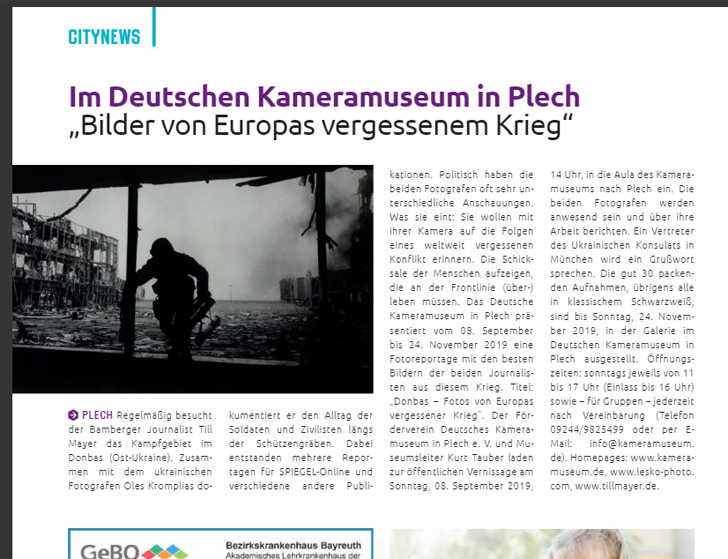 Ankündigung der Fotoausstellung "Donbas - Bilder von Europas vergessenem Krieg" im Deutschen Kameramuseum im September-2019-Heft des Bayreuth Journals.
